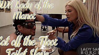 Thrall Doxy-Orgasma Celeste in ebony latex eating dog food and drinking piddle